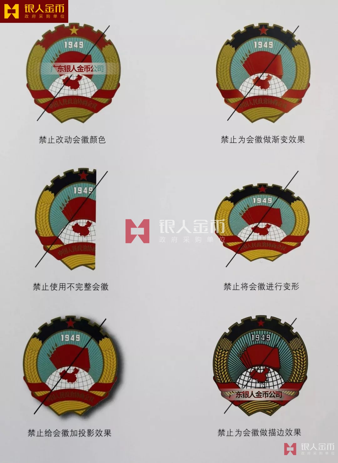 政協(xié)會(huì)徽在使用時(shí)必須嚴(yán)格按照規(guī)范執(zhí)行。為保證政協(xié)會(huì)徽的嚴(yán)肅性,嚴(yán)禁出現(xiàn)各類錯(cuò)誤與不規(guī)范的使用。以下列舉各例(不僅限于以下幾種),均是不規(guī)范的錯(cuò)誤使用。