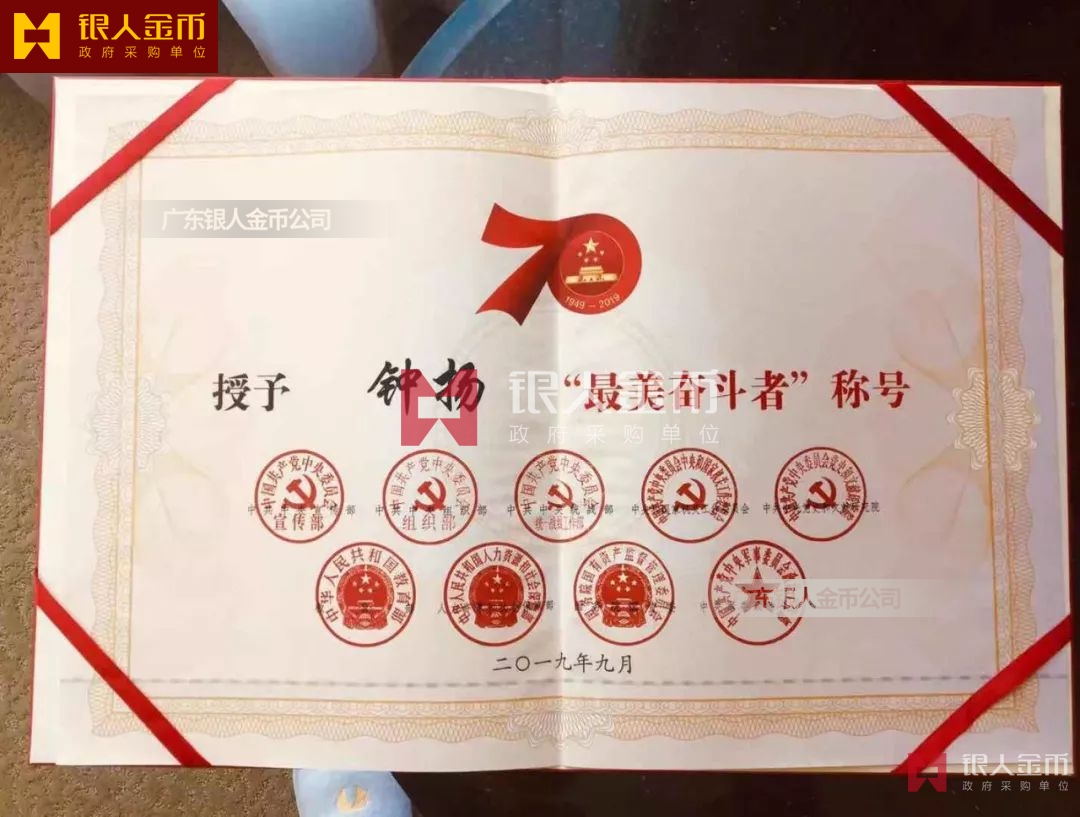 2019年,國慶七十周年之際,中宣部委派中央電視臺(tái)授權(quán)廣東銀人金幣公司為國慶70周年紀(jì)念章設(shè)計(jì)制造單位。過去社會(huì)上常常把金幣公司這個(gè)行業(yè)稱為“三特”行業(yè),指的是“生產(chǎn)特殊產(chǎn)品的、實(shí)行特殊管理的特殊行業(yè)”。