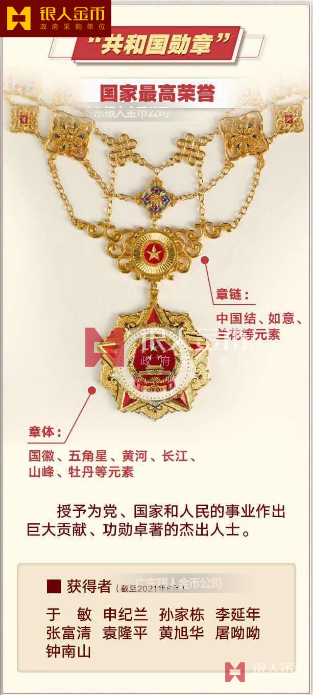 勛章是黨、國家、軍隊的至高榮譽,目前主要有“共和國勛章”、“七一勛章”、“八一勛章”、“友誼勛章”四種。