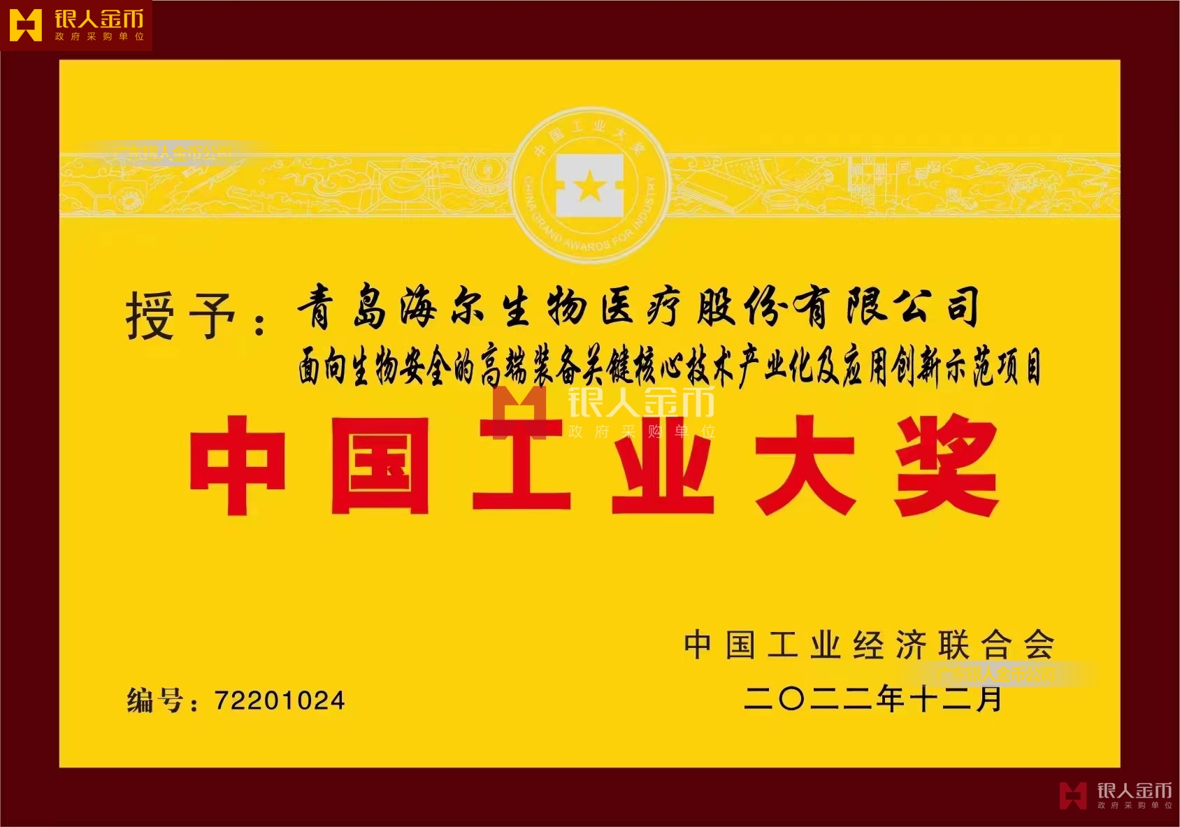 中國工業(yè)聯(lián)合會中國工業(yè)領(lǐng)域最高獎項-中國工業(yè)奧斯卡中國工業(yè)大獎獎牌獎杯證書(圖)【廣州銀人獎牌徽章廠有限公司】
