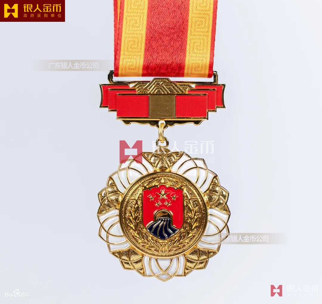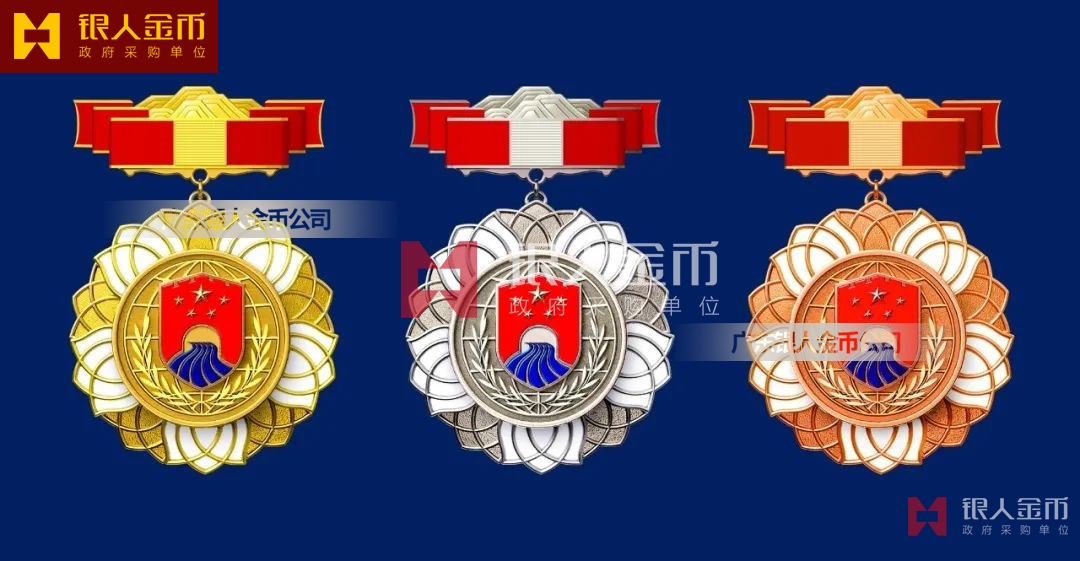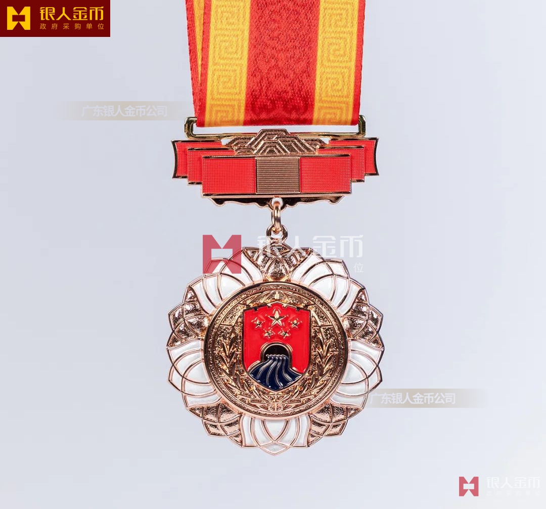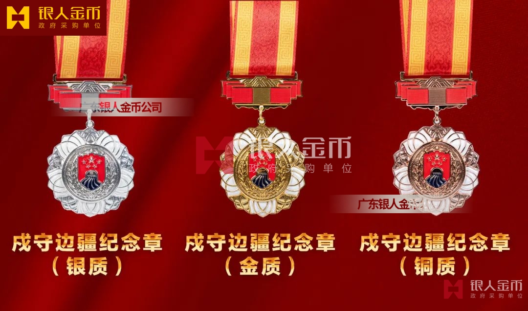 【產(chǎn)品】勛章由飄帶、獎?wù)掠缮椒?、紀(jì)念章由如意等元素構(gòu)成,金銀銅色條分別代表戍邊工作年限累計滿30年、20年、10年。