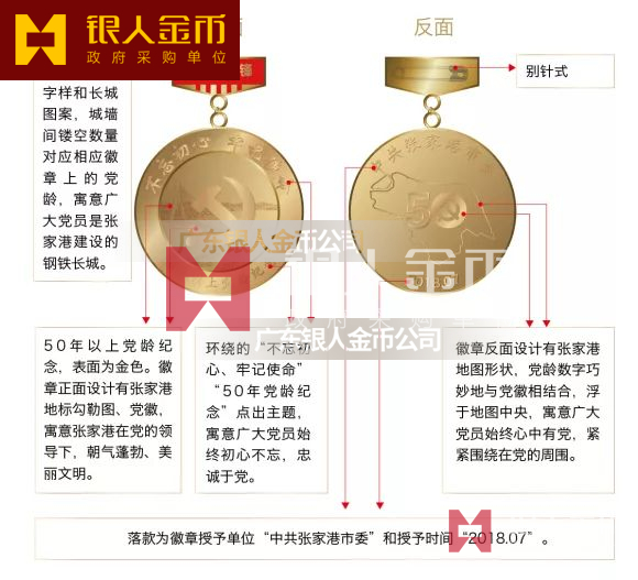 黨齡紀(jì)念章分為50年以上黨齡紀(jì)念、40年黨齡紀(jì)念、30年黨齡紀(jì)念三款,分別為金、銀、銅色,設(shè)計(jì)有黨徽、黨齡數(shù)字、張家港地標(biāo)、張家港地圖等元素,寓意全市廣大黨員始終不忘初心、牢記使命。