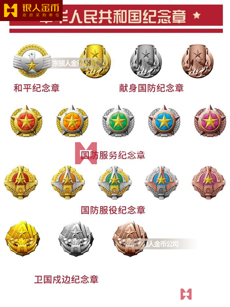 國防服務(wù)紀(jì)念章(按杰出貢獻和職務(wù)、軍兵種、服役年限分為:金質(zhì)、銀質(zhì)、銅質(zhì))