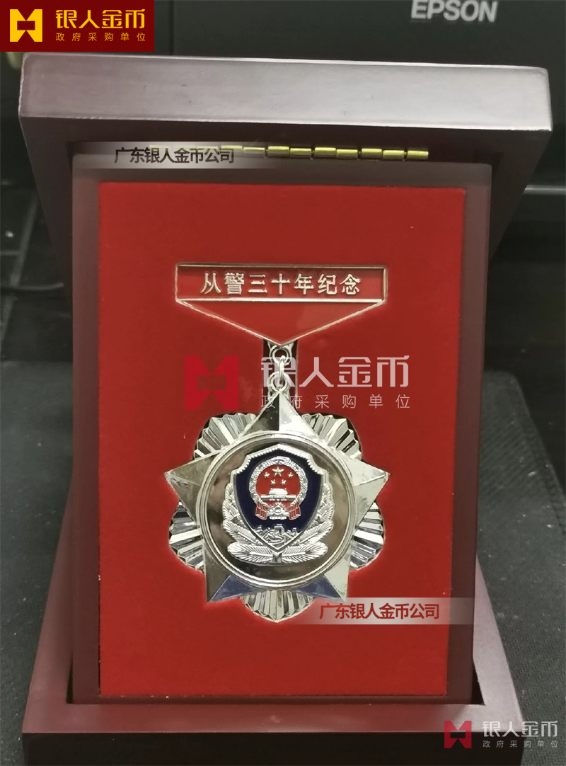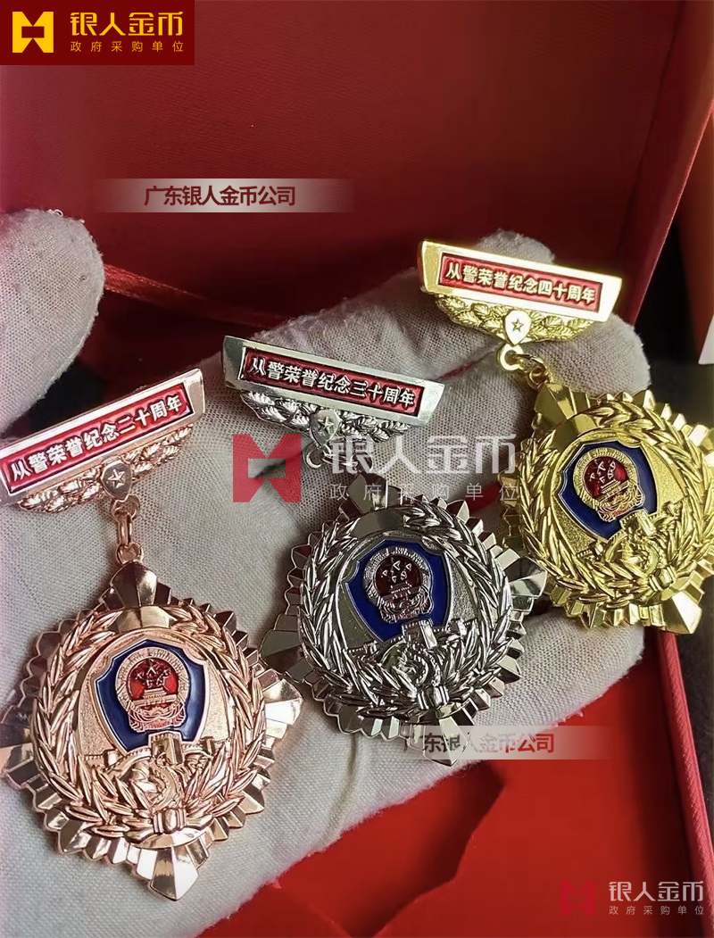 從警紀(jì)念章定制,從警年限紀(jì)念章定制,從警獎?wù)露ㄖ?/font>——從警紀(jì)念章的底下主體部分都是警徽,上面橫檔部分是不相同的,有:“從警十年紀(jì)念(從警10年紀(jì)念章)”、“從警二十年紀(jì)念(從警20年紀(jì)念章)”、“從警三十年紀(jì)念(從警30年紀(jì)念章)”、“從警四十年紀(jì)念(從警40年紀(jì)念章)”不同的,從警十年紀(jì)念章(從警10年獎?wù)拢┍砻媸清冦~色(銅質(zhì)獎?wù)拢?/span>、從警二十年紀(jì)念章(從警20年獎?wù)拢?/span>表面鍍銀色(銀質(zhì)獎?wù)拢?/span>、從警三十年紀(jì)念章(從警30年獎?wù)拢┖蛷木?/span>四十年紀(jì)念章(從警40年獎?wù)拢?/span>表面鍍金色(金質(zhì)獎?wù)拢?/span> ,整體將從警獎?wù)?/font>或從警紀(jì)念章(從警特定年限紀(jì)念章也叫從警章)鑲嵌在三折的立式木盒上面,木盒外面配有紙盒,整體做工精美,木盒紙盒上面都刻有警徽從警年限等。