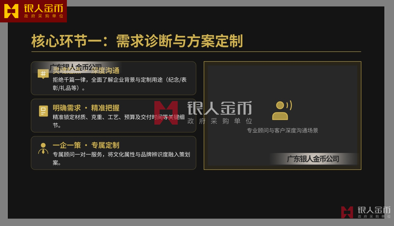 廣東銀人金幣公司針對(duì)高端客群對(duì)獨(dú)特性的追求,提供深度的個(gè)性化定制服務(wù).基于客戶需求,結(jié)合黃金制品與企業(yè)文化元素,定做獨(dú)一無(wú)二的專屬珍品,極大提升了企業(yè)的價(jià)值感和尊崇感!