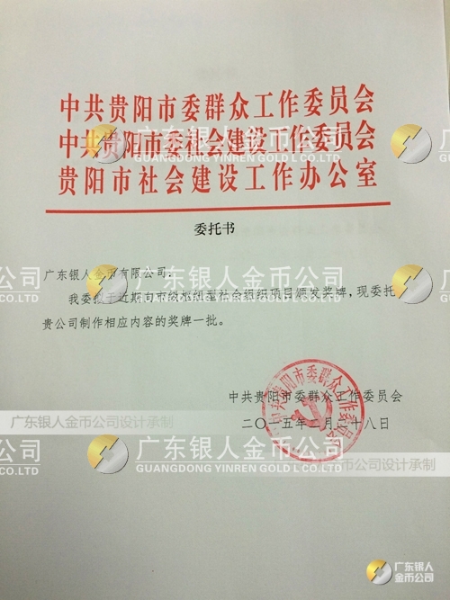 廣東銀人金幣公司設(shè)計制作承接中共貴陽市委、民政局、財政局、群工委、中共貴陽市委社會建設(shè)工作委員會、貴陽市社會建設(shè)工作辦公室表彰樞紐型社會組織項目榮譽(yù)獎狀、先進(jìn)集體獎牌、先進(jìn)單位獎牌、先進(jìn)個人牌匾、高檔鈦金獎牌定制。