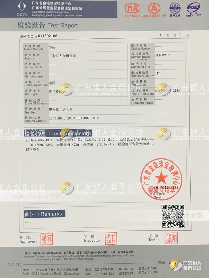 廣東銀人金幣公司承接客戶個(gè)性化定制的金銀幣、金銀章、金銀條、金銀牌、金銀盤均由國家質(zhì)監(jiān)部門、嚴(yán)格檢測、權(quán)威鑒定: