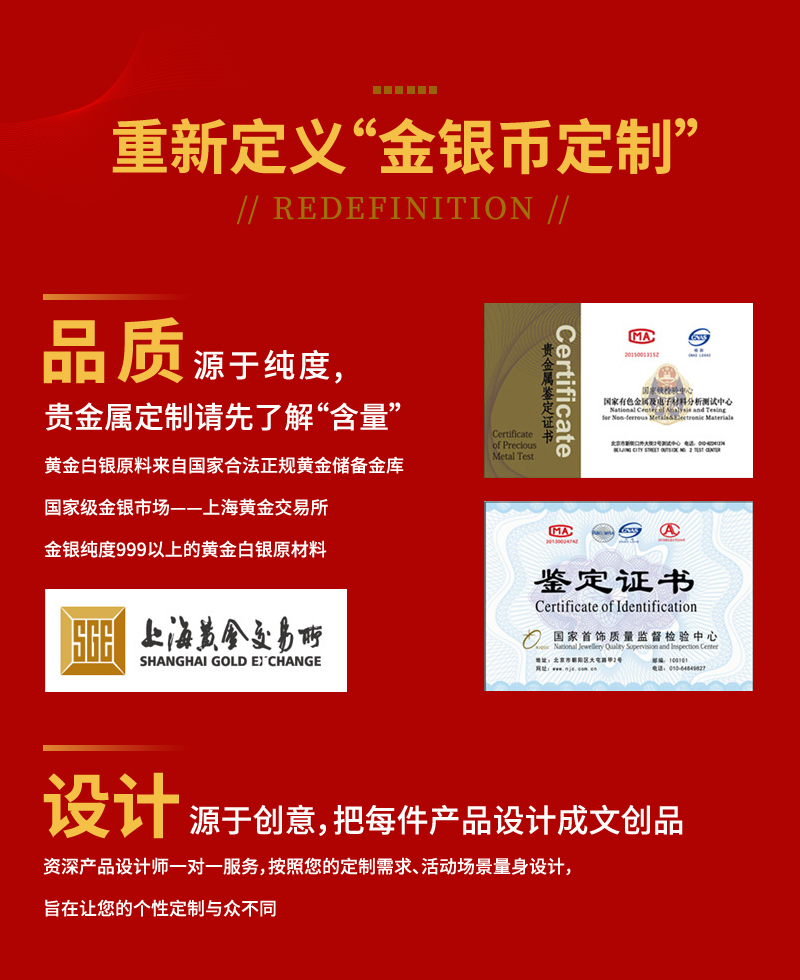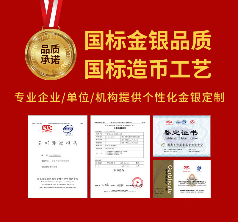 廣東銀人金幣公司承接客戶個(gè)性化定制的金銀幣、金銀章、金銀條、金銀牌、金銀盤(pán)均由國(guó)家質(zhì)監(jiān)部門、嚴(yán)格檢測(cè)、權(quán)威鑒定: